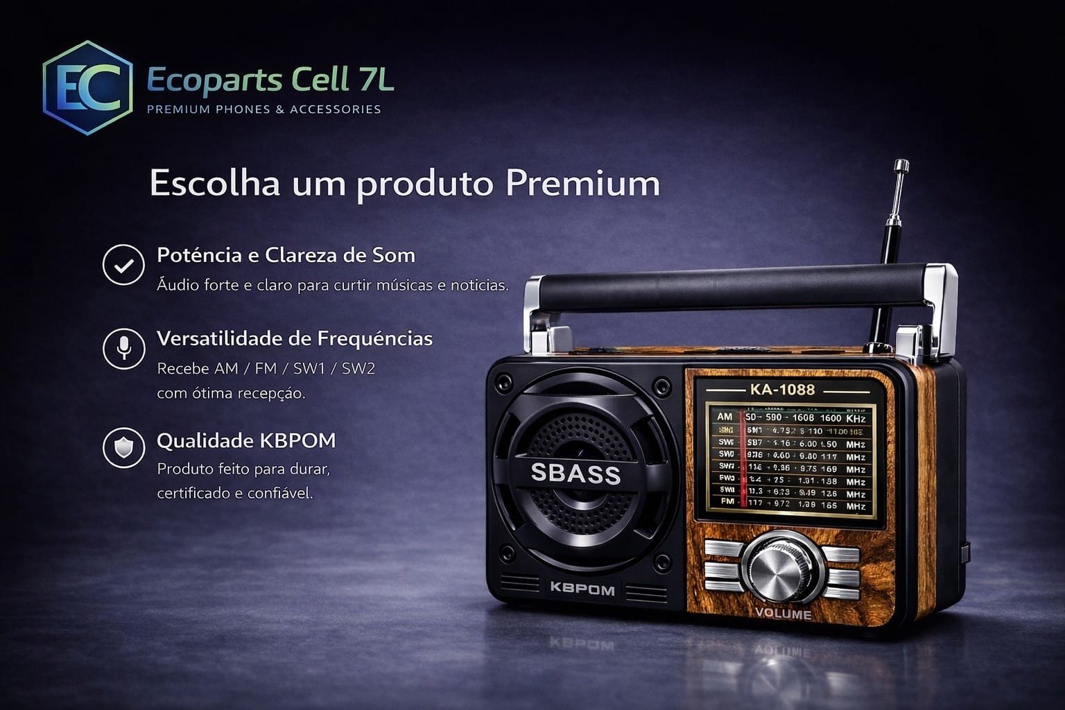 O KBPOM KA-1088 é a escolha ideal para quem valoriza som potente, excelente recepção e design clássico com acabamento premium.